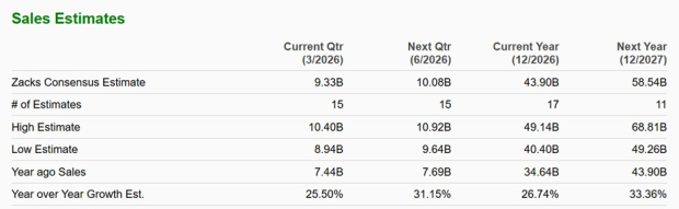 However, AMD’s Q1 revenue guidance of $9.8 billion ± $300 million still came in above Wall Street’s consensus of $9.33 billion (Current Qtr below). This would equate to at least 27% growth, with AMD expected to post high-double-digit sales and EPS expansion in FY26 and FY27 as well.