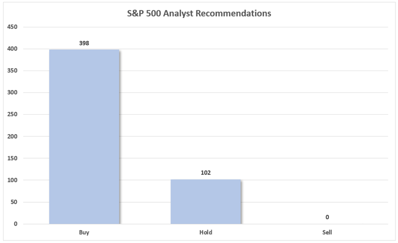 But even I was surprised by how ridiculous it’s gotten. Take a look at consensus analyst recommendations on the S&P 500’s components: