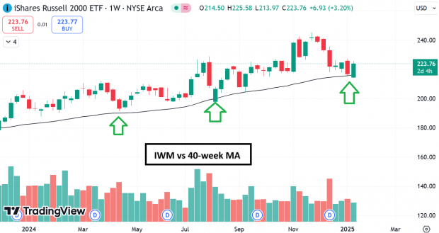 Small cap stocks and the Russell 2000 Index ETF (IWM) are up more than 3% after finding support at the 40-weel moving average – a level bulls have defended for more over a year. Renewed participation by small caps and forgotten-about stocks like KB Home (KBH) and Bank of America (BAC) is a bullish and healthy signal.
