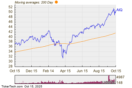 Looking at the chart above, AIQ’s low point in its 52 week range is $30.60 per share, with $51.58 as the 52 week high point — that compares with a last trade of $50.87. Comparing the most recent share price to the 200 day moving average can also be a useful technical analysis technique — learn more about the 200 day moving average ».