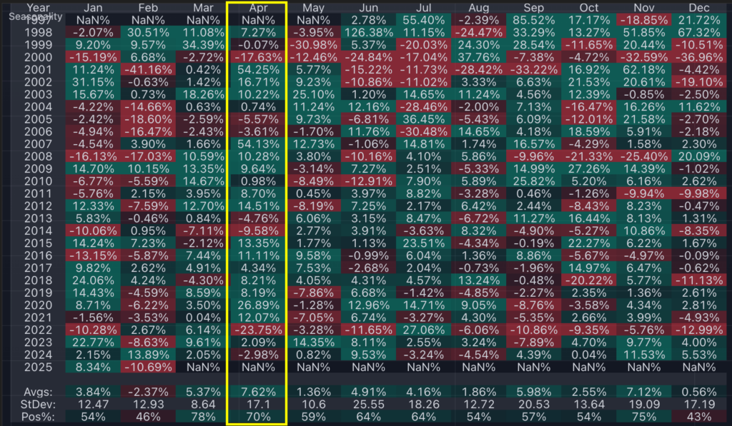 While the stock is relatively flat for 2025, it has endured a sharp 20%-plus drawdown from its February peak, giving traders another reason to watch the April window closely.