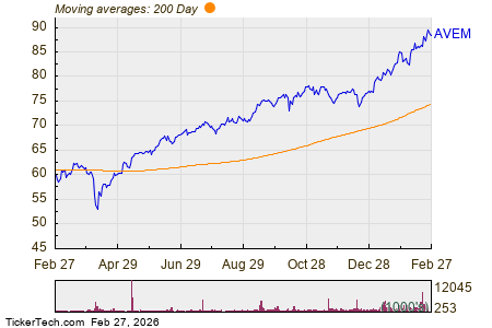 The chart below shows the one year price performance of AVEM, versus its 200 day moving average: