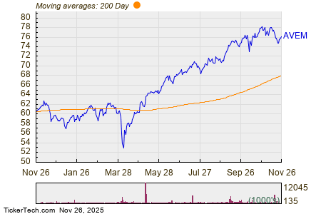 The chart below shows the one year price performance of AVEM, versus its 200 day moving average: