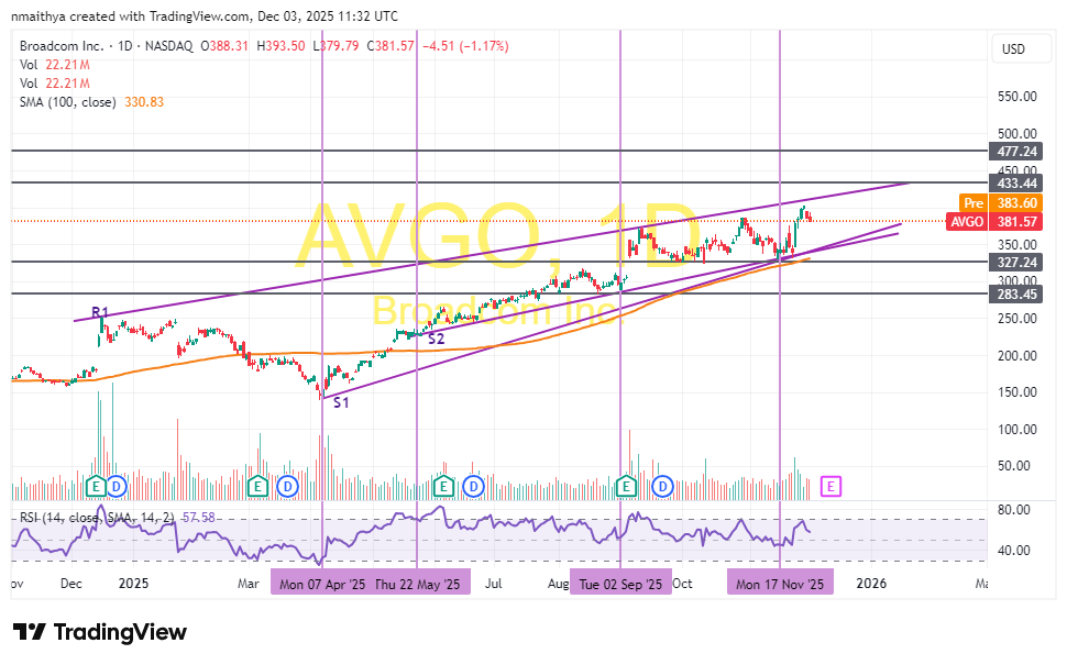 Broadcom (AVGO) Technical Analysis, Daily ChartFrom a technical perspective, Broadcom shares trade within an ascending wedge formation, which indicates short-term volatility will likely continue at least until the company releases its fiscal fourth quarter and full-year 2025 financial results on December 11.