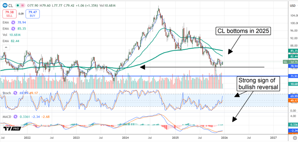 CL chart shows the stock forming a potential 2025 bottom at long-term support with momentum indicators signaling an early bullish reversal.