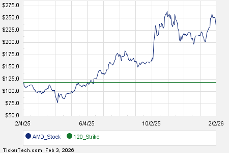 The chart above, and the stock’s historical volatility, can be a helpful guide in combination with fundamental analysis to judge whether selling the December 2028 put at the $120 strike for the 4.9% annualized rate of return represents good reward for the risks. We calculate the trailing twelve month volatility for Advanced Micro Devices Inc (considering the last 251 trading day closing values as well as today’s price of $244.68) to be 59%. For other put options contract ideas at the various different available expirations, visit the AMD Stock Options page of StockOptionsChannel.com.