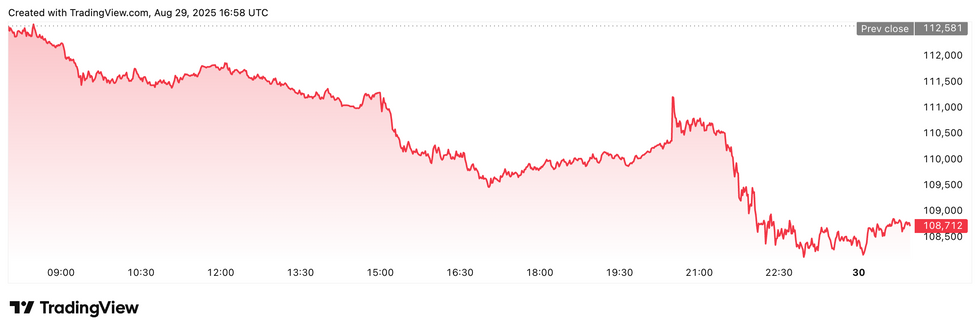 Bitcoin price performance, August 29, 2025.