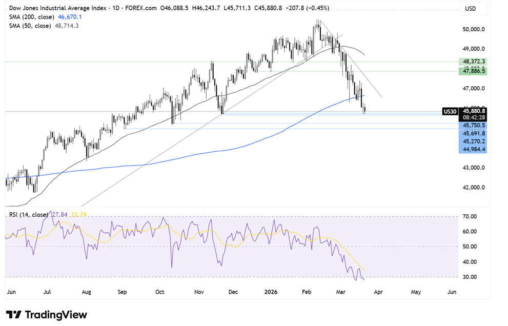 The Dow Jones has been trending lower since the start of the year after reaching a record high of 50,525. The index is trading below its falling trendline and has broken below the 200-day SMA, as well as support at 45,700 — the November 2025 low.