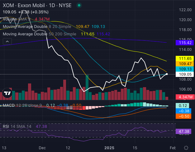 Additionally, the MACD indicator at a negative 0.38 signals continued downside momentum, while the RSI at 47.38 suggests Exxon Mobil stock is approaching oversold territory but has yet to reach a reversal zone.