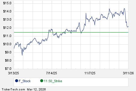 Below is a chart showing the trailing twelve month trading history for Ford Motor Co., and highlighting in green where the $11.50 strike is located relative to that history: