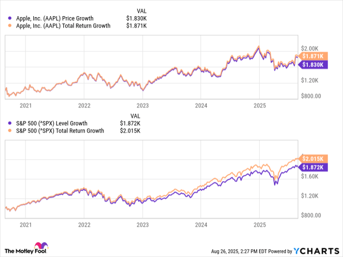 When you zoom out, Apple’s performance hasn’t been terrible, but it also hasn’t been what you might expect from one of the most successful businesses in history. If you had invested $1,000 in Apple stock five years ago, your investment would be worth around $1,830 today, or $1,870 if you include dividends.