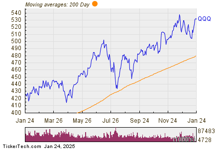 Looking at the chart above, QQQ’s low point in its 52 week range is $413.07 per share, with $539.15 as the 52 week high point — that compares with a last trade of $531.85. Comparing the most recent share price to the 200 day moving average can also be a useful technical analysis technique — learn more about the 200 day moving average ».