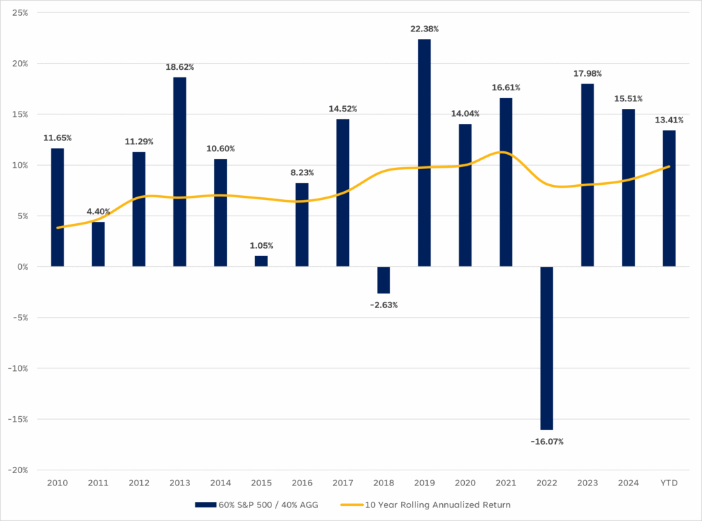 Annual return of a hypothetical 60% S&P 500/40% AGG portfolio since 2010 with 3-year, 5-year, and 10-year annualized rolling returnsS&P 500 Annualized Return