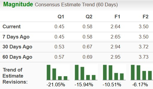 For 2025, the Zacks Consensus Estimate for TSLA’s revenues is pegged at $104.8 billion, implying a rise of 7.3% year over year. The consensus mark for 2025 EPS is pegged at $2.64, implying growth of around 9% on a year-over-year basis.