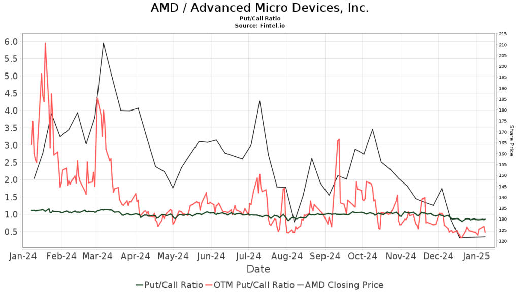There are 3,834 funds or institutions reporting positions in Advanced Micro Devices. This is an increase of 33 owner(s) or 0.87% in the last quarter. Average portfolio weight of all funds dedicated to AMD is 0.59%, an increase of 10.15%. Total shares owned by institutions increased in the last three months by 0.72% to 1,224,613K shares. AMD / Advanced Micro Devices, Inc. Put/Call Ratios The put/call ratio of AMD is 0.83, indicating a bullish outlook.