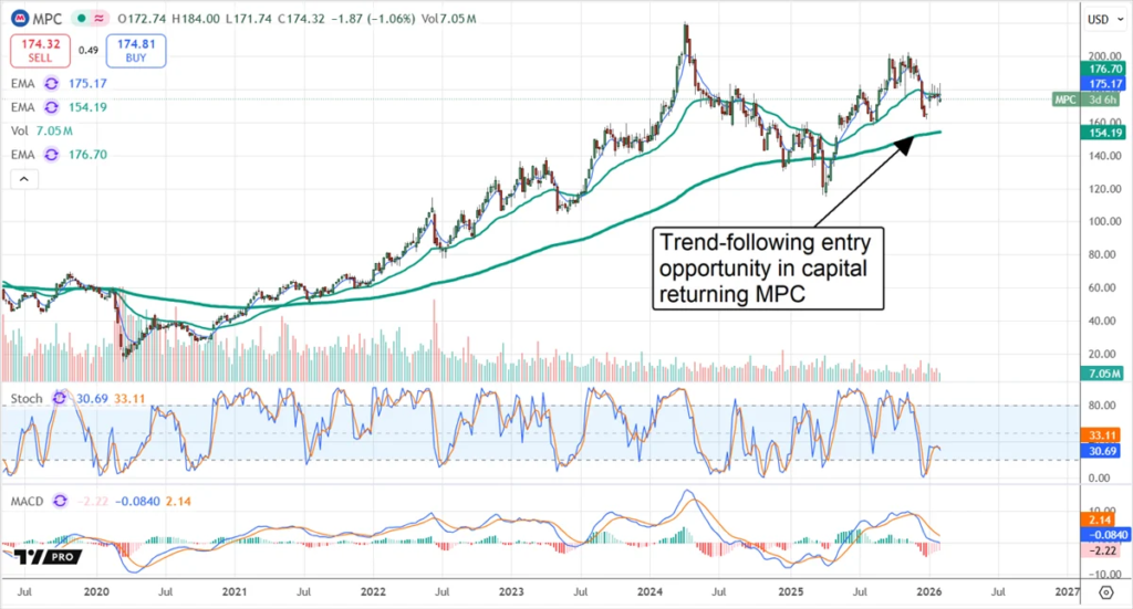 The post-release price action has been favorable. MPC price advanced following the release, extending a rebound that began in early 2026. The movement shows support at a pair of long-term EMAs, signaling a trend-following entry for investors.