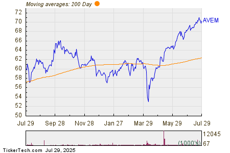 The chart below shows the one year price performance of AVEM, versus its 200 day moving average: