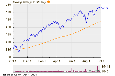Reflecting on the chart, VOO’s 52-week low stands at $375.945 per share, with $529.92 marking the high point. At the latest trade, the share price stood at $522.76. Comparing the current share price against the 200-day moving average serves as a valuable technical analysis method.