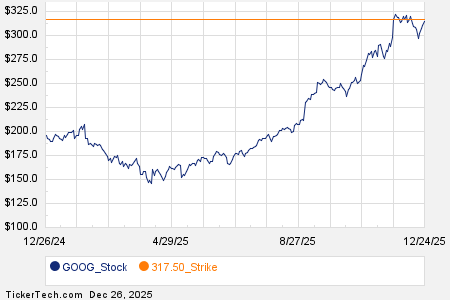 Looking at options trading activity among components of the S&P 500 index, there is noteworthy activity today in Alphabet Inc (Symbol: GOOG), where a total volume of 100,673 contracts has been traded thus far today, a contract volume which is representative of approximately 10.1 million underlying shares (given that every 1 contract represents 100 underlying shares). That number works out to 44.7% of GOOG’s average daily trading volume over the past month, of 22.5 million shares. Especially high volume was seen for the $317.50 strike call option expiring December 26, 2025, with 10,324 contracts trading so far today, representing approximately 1.0 million underlying shares of GOOG. Below is a chart showing GOOG’s trailing twelve month trading history, with the $317.50 strike highlighted in orange: