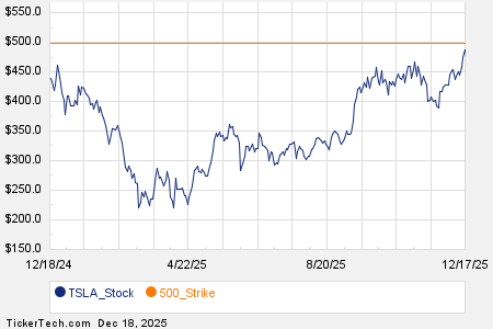 Looking at options trading activity among components of the S&P 500 index, there is noteworthy activity today in Tesla Inc (Symbol: TSLA), where a total volume of 2.1 million contracts has been traded thus far today, a contract volume which is representative of approximately 214.0 million underlying shares (given that every 1 contract represents 100 underlying shares). That number works out to 272.3% of TSLA’s average daily trading volume over the past month, of 78.6 million shares. Especially high volume was seen for the $500 strike call option expiring December 19, 2025, with 127,490 contracts trading so far today, representing approximately 12.7 million underlying shares of TSLA. Below is a chart showing TSLA’s trailing twelve month trading history, with the $500 strike highlighted in orange: