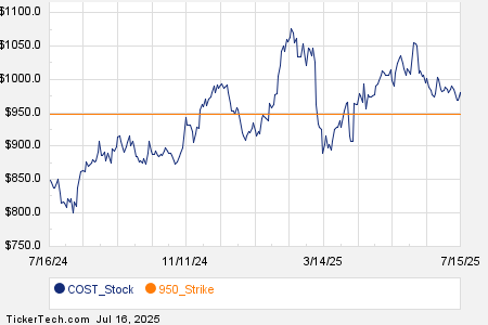 Looking at options trading activity among components of the Russell 3000 index, there is noteworthy activity today in Costco Wholesale Corp (Symbol: COST), where a total volume of 42,491 contracts has been traded thus far today, a contract volume which is representative of approximately 4.2 million underlying shares (given that every 1 contract represents 100 underlying shares). That number works out to 206.6% of COST’s average daily trading volume over the past month, of 2.1 million shares. Especially high volume was seen for the $950 strike put option expiring July 18, 2025, with 1,562 contracts trading so far today, representing approximately 156,200 underlying shares of COST. Below is a chart showing COST’s trailing twelve month trading history, with the $950 strike highlighted in orange: