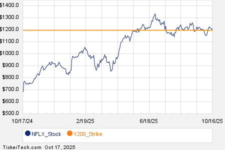 Among the underlying components of the S&P 500 index, we saw noteworthy options trading volume today in Netflix Inc (Symbol: NFLX), where a total of 69,401 contracts have traded so far, representing approximately 6.9 million underlying shares. That amounts to about 226% of NFLX’s average daily trading volume over the past month of 3.1 million shares. Particularly high volume was seen for the $1200 strike call option expiring October 17, 2025, with 5,967 contracts trading so far today, representing approximately 596,700 underlying shares of NFLX. Below is a chart showing NFLX’s trailing twelve month trading history, with the $1200 strike highlighted in orange: