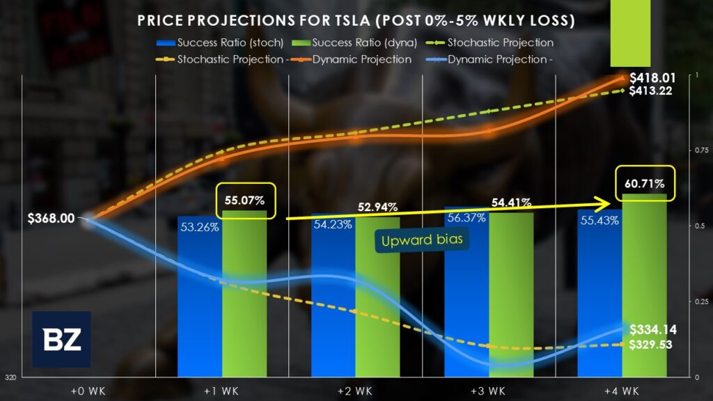 However, the math gets more compelling based on certain conditions. At this moment, TSLA stock is trending to lose no more than 5% of value for the business week ending Feb. 7. Whenever TSLA loses up to 5% during a one-week period, the long odds for the subsequent week stand at 55.07%. Over the next four weeks, the chances of upside improve to 60.71%.