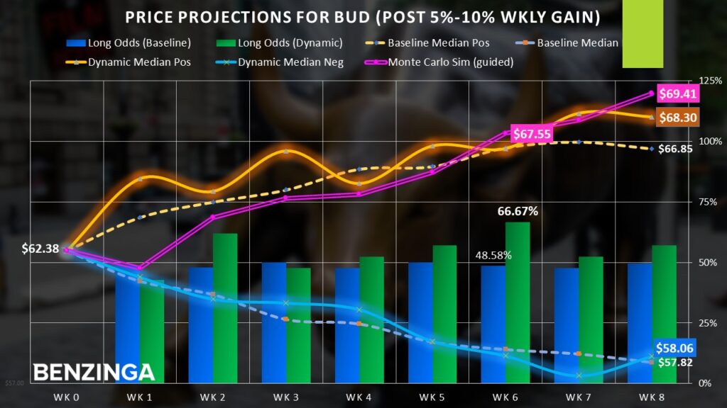 However, under the dynamic conditions of sizable momentum (defined as a weekly return between 5% to 10%), the subsequent eight weeks commands long odds of 57.14%. In the past five sessions, BUD is up around 5.4%.