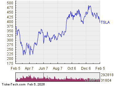 Looking at the chart above, TSLA’s low point in its 52 week range is $214.25 per share, with $498.83 as the 52 week high point — that compares with a last trade of $397.06.