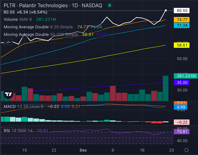 Technically, PLTR stock is on a tear. Its share price of $80.55 is comfortably above the eight, 20 and 50-day simple moving averages (SMAs), signaling strong bullish momentum. However, with a relative strength index (RSI) of 70.81, it’s entering overbought territory—a red flag for cautious investors.