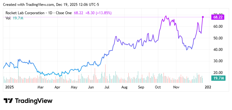 Following the IPO chatter, Rocket Lab shares surged, gaining more than 20% in the days after the news was widely reported in early December. The stock briefly pushed toward the mid-$60s before pulling back to the low-$50s.