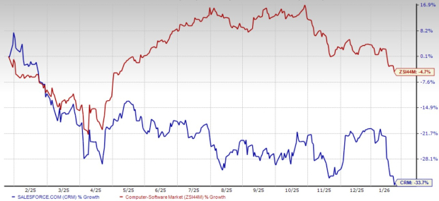 Shares of Salesforce have plunged 33.7% over the past year against the Zacks Computer – Software industry’s decline of 4.7%.