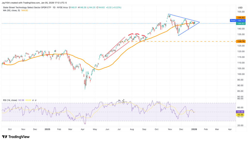 Looking at XLK more broadly, the sector has been largely stagnant over the past few weeks, effectively consolidating within a triangle pattern. As a result, the next move for the group is highly uncertain and could break in either direction.