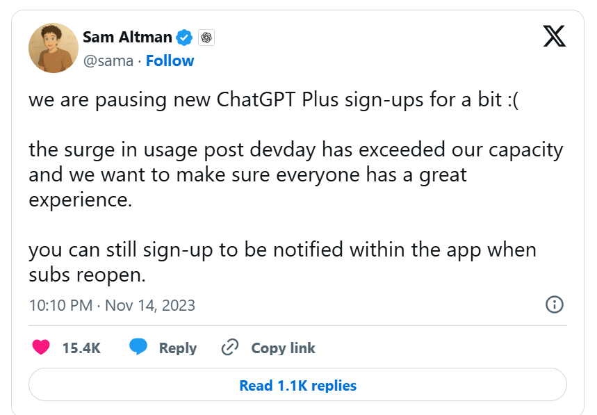 It was because demand had exploded. In its first year, ChatGPT reached 100 million weekly active users. And after its first developers conference on November 6, 2023 – where the company unveiled ChatGPT Plus – the number of wannabe subscribers surged rapidly.