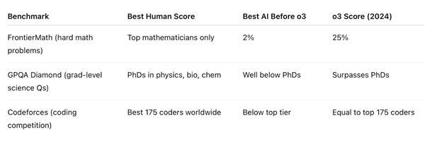 In late 2024, the o3 model beat human PhDs on the GPQA Diamond benchmark – a brutal set of graduate-level questions in physics, biology, and chemistry.