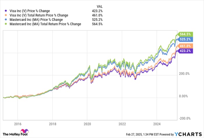 In the full-year 2024, Visa delivered 10% and 17% growth in revenue and earnings per share (EPS), respectively. Its network processed nearly $16 trillion worth of transactions in the year. Mastercard delivered 13% revenue and 17% EPS growth in 2024, processing transactions worth almost $10 trillion during the year. While Visa generated an operating margin of 66% in 2024, Mastercard reported an operating margin of 55%. Both stocks have generated humongous returns for shareholders over the years, with and without reinvested dividends.