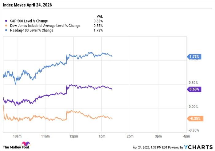 The major U.S. stock indexes are posting mixed results at midday on Friday, April 24. Semiconductor stocks are driving sharp gains in the tech-heavy benchmarks while the Dow Jones Industrial Average (DJINDICES: ^DJI) lags behind.