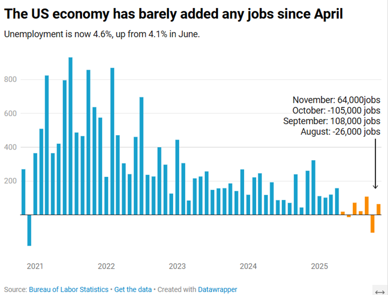 The government shutdown may have distorted the data. But it’s not the whole story. More companies are slowing hiring and trimming headcount as they focus on efficiency – producing more with fewer workers. That helps explain why GDP growth can remain strong even as job creation cools.