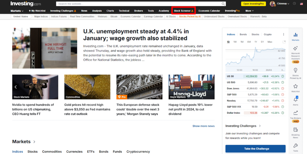 The first step is to navigate to the Investing.com home page and click the “Stock Screener” button located at the top of the page, as shown in the image below.