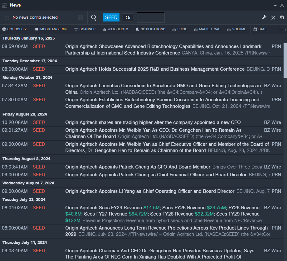 - SEED Price Action: Shares of Origin Agritech fell 2.2% to close at $1.78 on Thursday.