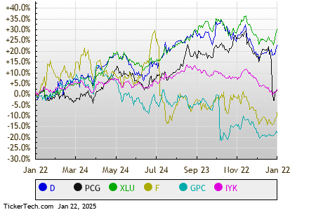 Looking at the sectors faring worst as of midday Wednesday, shares of Utilities companies are underperforming other sectors, showing a 1.9% loss. Within that group, Dominion Energy Inc (Symbol: D) and PG&E Corp (Symbol: PCG) are two large stocks that are lagging, showing a loss of 4.5% and 4.0%, respectively. Among utilities ETFs, one ETF following the sector is the Utilities Select Sector SPDR ETF (Symbol: XLU), which is down 1.7% on the day, and up 3.98% year-to-date. Dominion Energy Inc, meanwhile, is down 0.88% year-to-date, and PG&E Corp, is down 17.62% year-to-date. Combined, D and PCG make up approximately 6.8% of the underlying holdings of XLU.