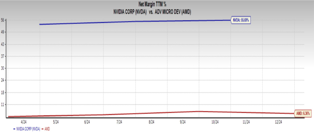 NVIDIA, anyhow, generates profits more efficiently than AMD. NVIDIA’s net profit margin of 55.7% is higher compared to AMD’s 6.4%, showing a high margin.